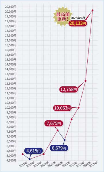 実は今、金の相場価格が最高値を更新していて、25年前の約11倍、歴史的高水準となっているんです。