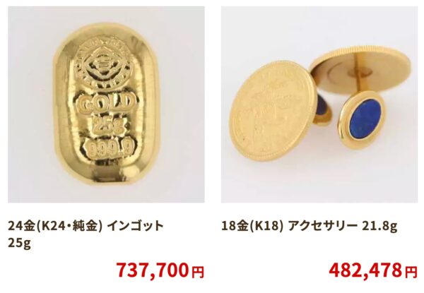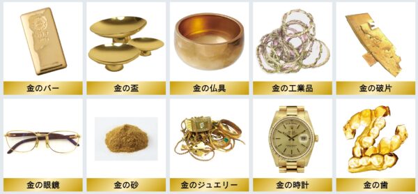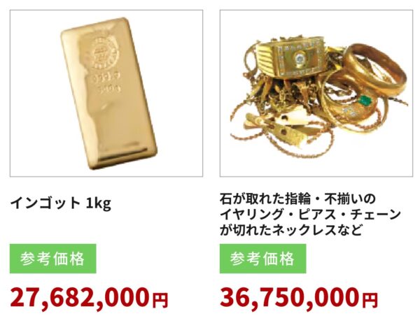 - 金・インゴット・24K・18Kからアクセサリーまで、金製品をまとめて査定できる