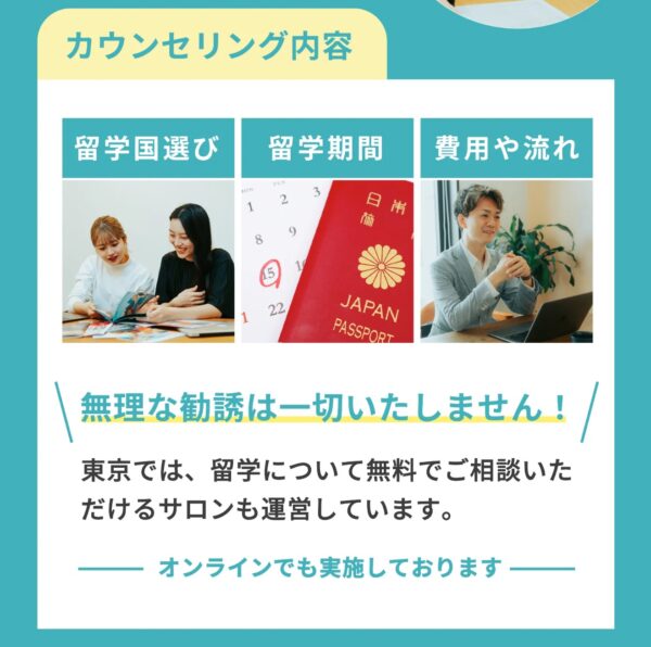 また、カウンセラーは過去の留学生のケーススタディに基づいて具体的な提案をしてくれるため、自分一人では気づけない選択肢やリスクも事前に知ることができます。