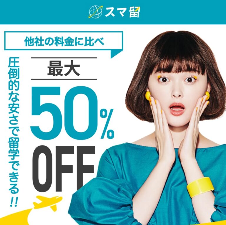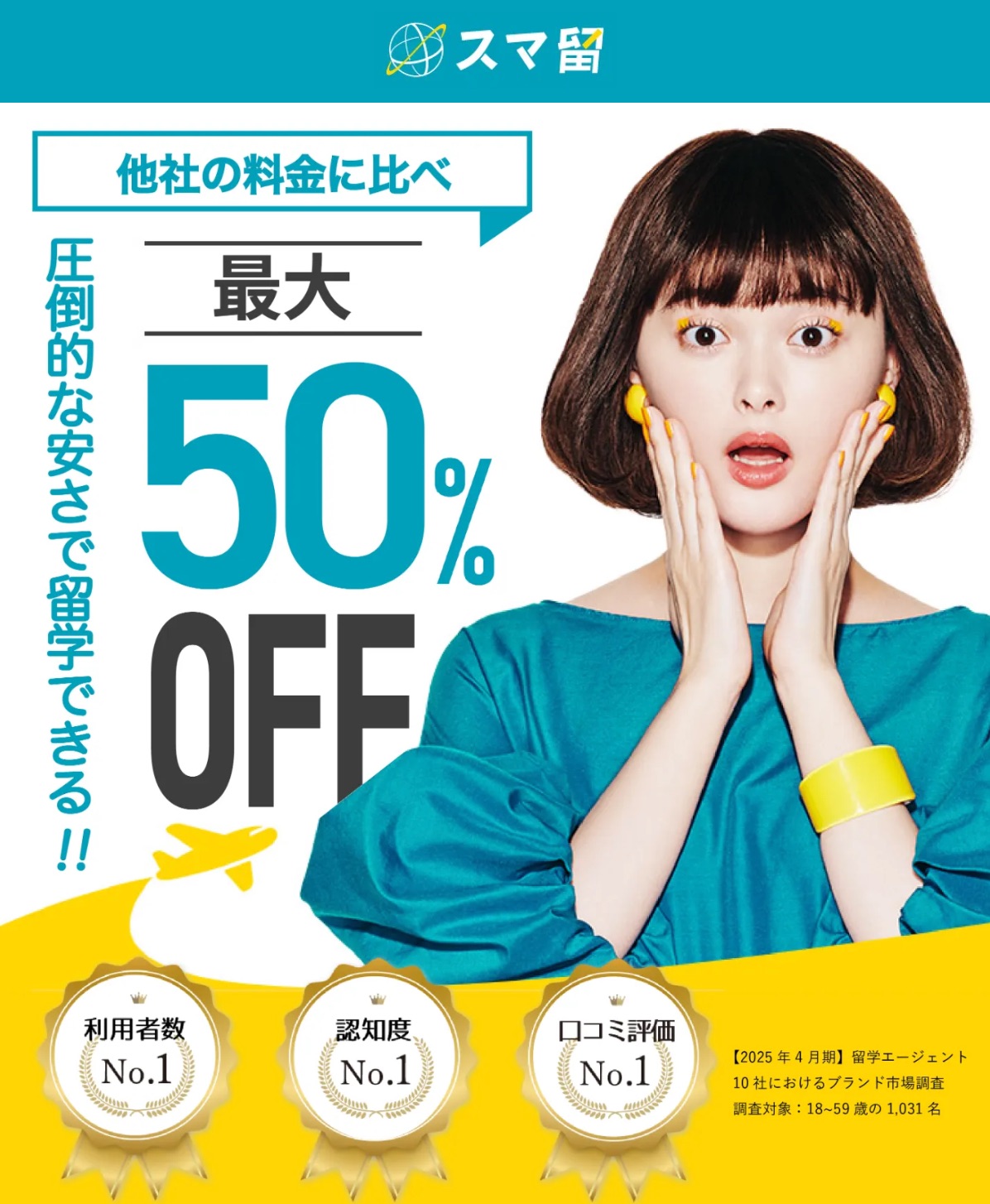 スマ留は従来の留学費用の最大50%OFF*を実現した圧倒的な留学費用の安さが特徴的。