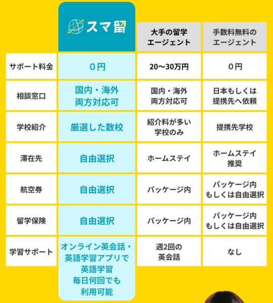 エージェントの手数料が20万円〜30万円ほどかかるケースもありますが、留学費用を抑えたいなら、仲介手数料が無料のエージェントを利用するのがおすすめです。