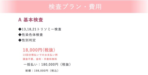 基本検査(13・18・21トリソミー+性染色体+性別判定)は198,000円(税込)。全染色体検査や微小欠失検査を含む上位プランも用意されています。