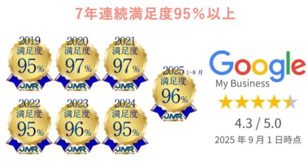 ※1 日本マーケティングリサーチ機構調べ。調査概要:2019年,2020年,2021年,2022年,2023年,2024年,2025年1-8月,新型出生前診断サービスに対する顧客満足度調査。